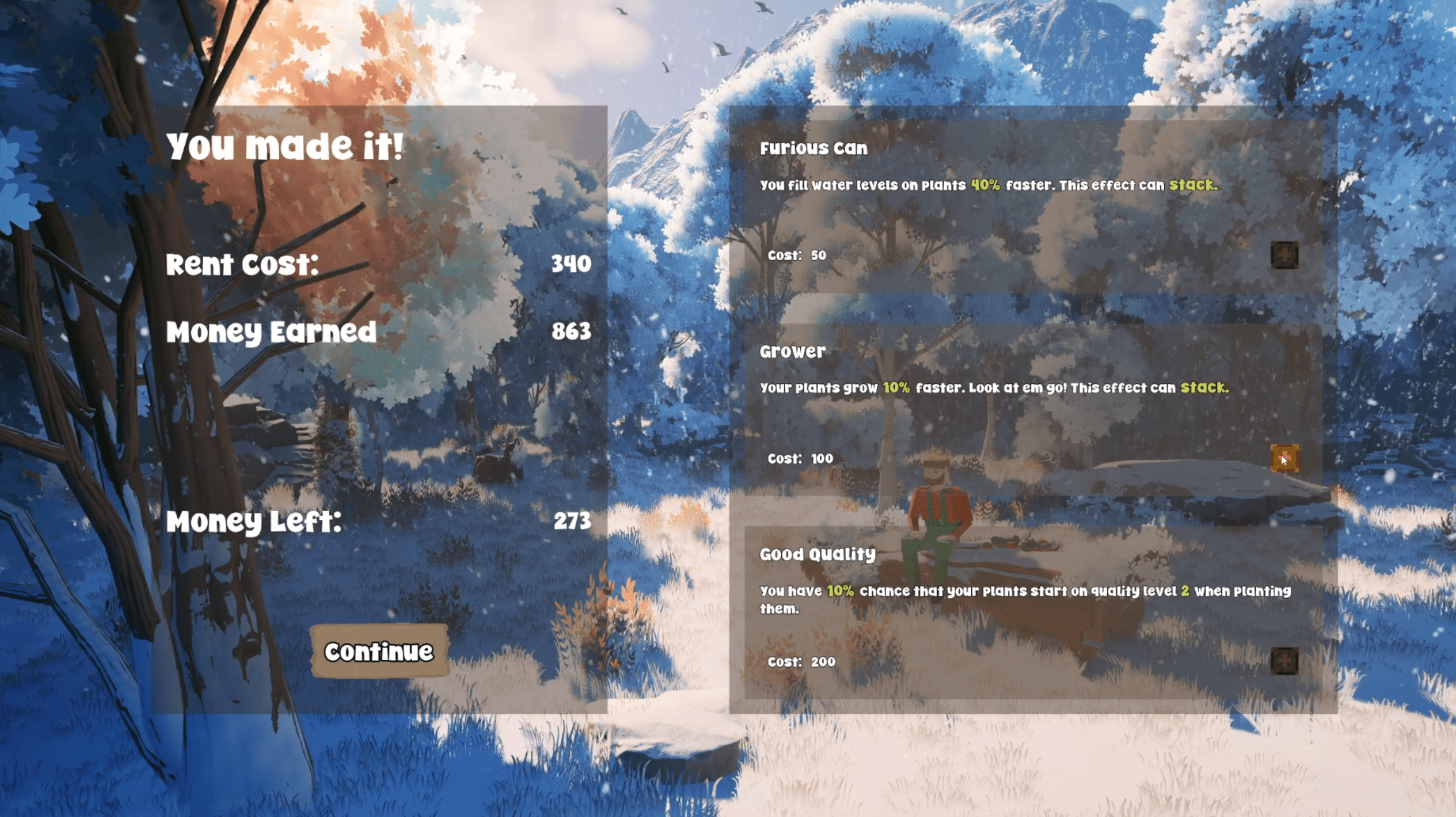 When the year ends and winter arrives, you'll have to pay your rent. If you've earned enough money, any extra cash can be spent on upgrades that help you work more efficiently in the next season. And then you simply go again. With more plant plots, larger fields, and the increasing challenge of keeping everything under control.