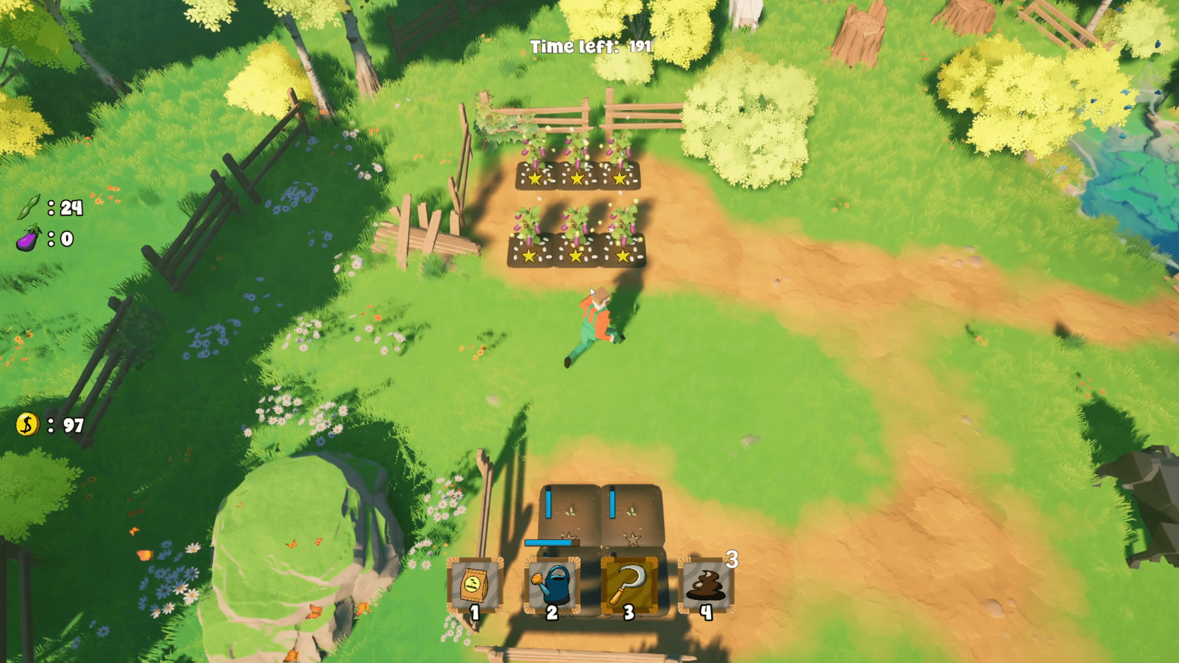 The idea behind the game is, that you play as a retired person, who decided to become a hobby farmer. One level equals one year, but every year you get more plant plots, more space and with that you have to pay more rent by the end of the year. You have to grow your crops, collect fertilizer from your cows and harvest your plants to have enough money by the end of the year. If you do extra well, you will end up with extra money which you can spent on upgrades that help you be more efficient during the next year.